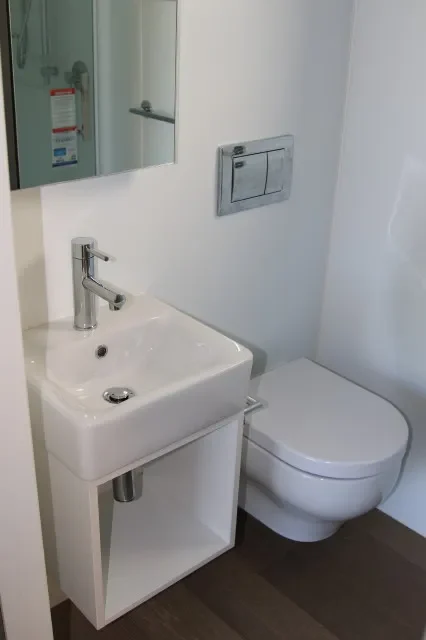 • Full bathroom incl. acrylic shower, wall-hung toilet and basin.