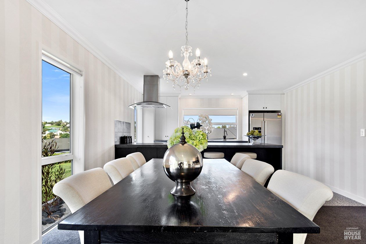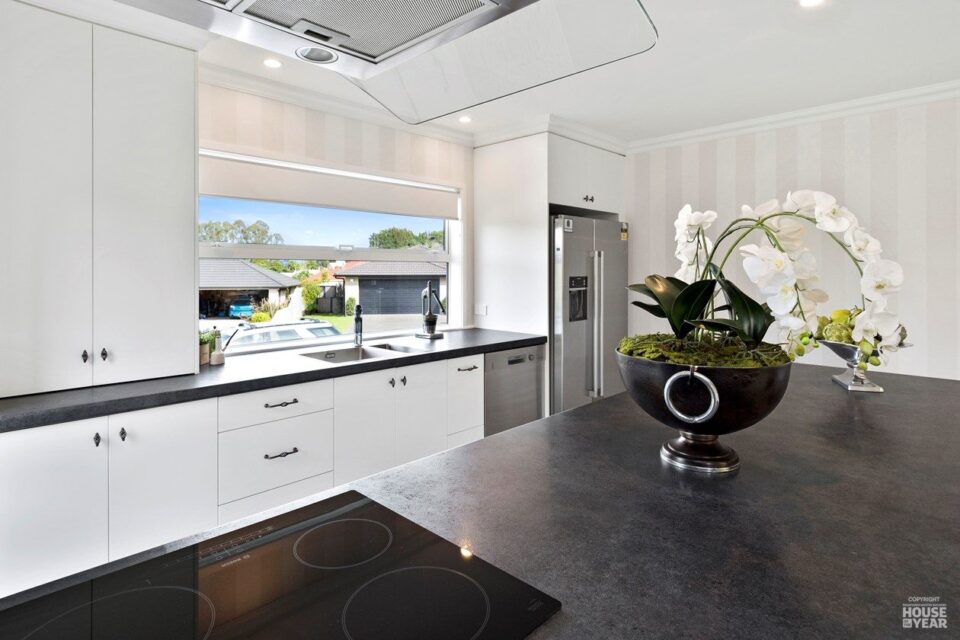 Inside, crystal lighting enhances the home’s refined aesthetic—whether it’s statement chandeliers in the stairwell and dining room or subtle accents in the bedrooms and foyer, every fixture has been chosen to add a touch of sophistication. The contemporary two-tone kitchen, complete with breakfast island and antique handles, strikes a balance between bold design and classic charm. Textural contrasts like black patterned tiles and aggregate-look vinyl flooring provide depth while maintaining an understated elegance.