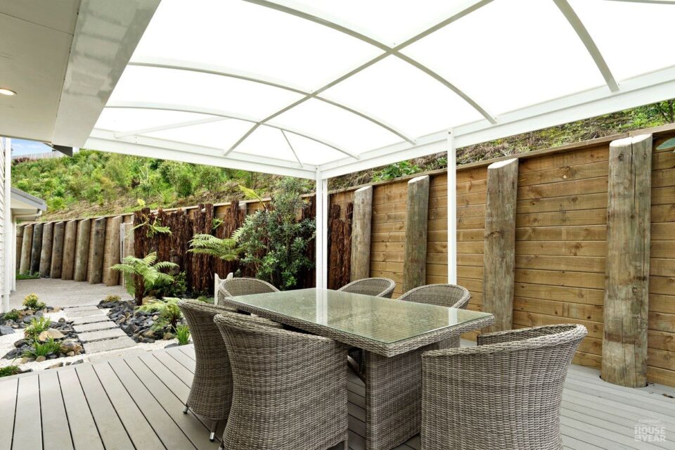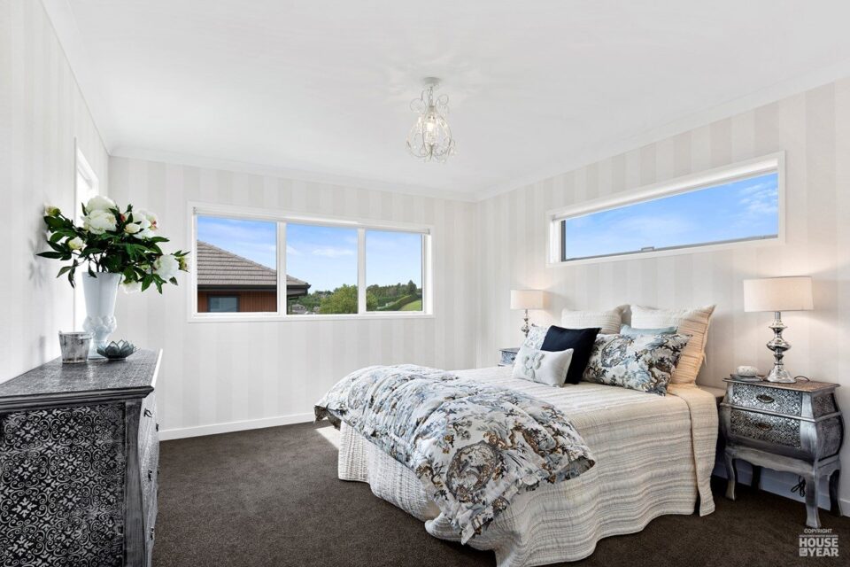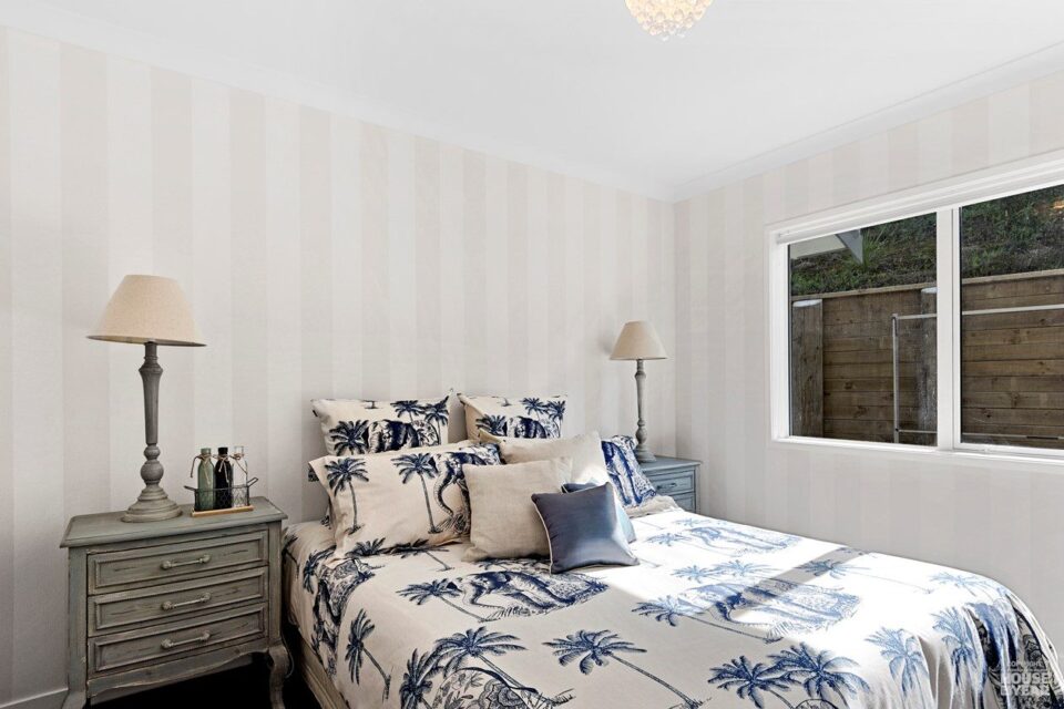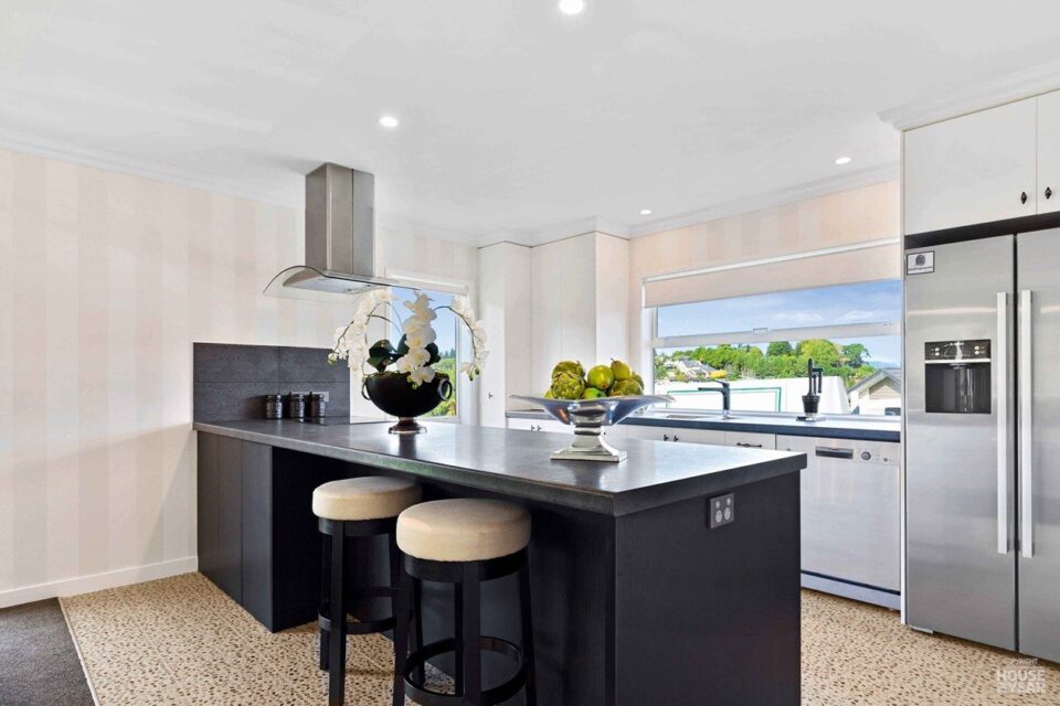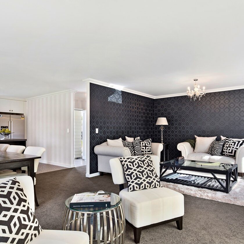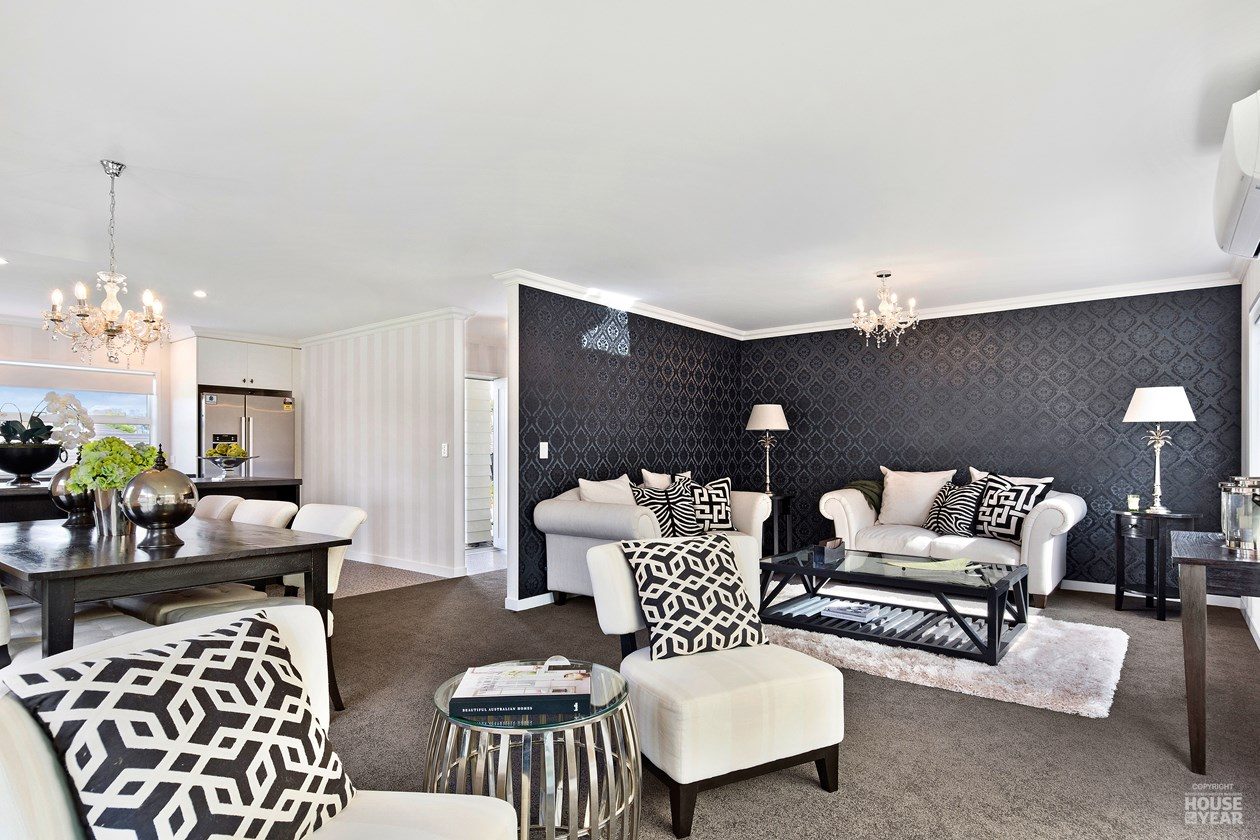 With a layout designed for seamless everyday living, the home offers a light-filled open-plan lounge featuring striking black embossed wallpaper, which beautifully interacts with natural light throughout the day.