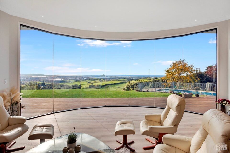 A 7.7-meter-wide curved, faceted window—glazed with 21.1mm laminated glass—now frames an uninterrupted 180-degree view, redefining the home’s connection to its surroundings.